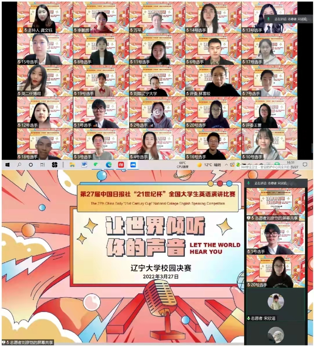 为了创造浓厚的校园文化氛围,夯实学生专业基本功,为同学们提供自我展示的平台,同时为上一级比赛选拔优秀选手,外国语学院于2022年3月27日下午,以线上腾讯会议的方式成功举办了第27届中国日报社“21世纪杯”全国大学生英语演讲比赛辽宁大学(专业组)校园选拔赛。