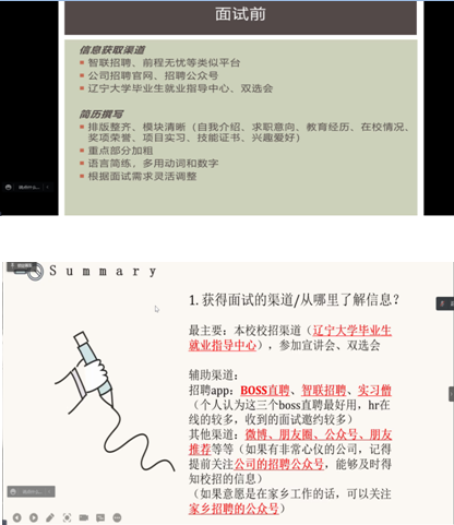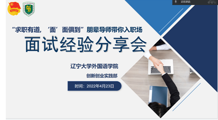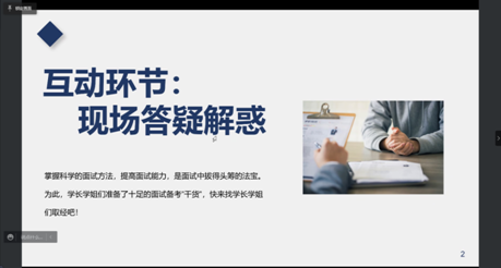 为了提高同学们对面试的认识,掌握科学面试方法,提高面试能力,外国语学院于 4月23日成功举办了面试经验分享会。学长学姐们将经验倾囊相授,为同学们提供了十足的面试“干货”;虽然因为疫情无法面对面进行交流,但同学们热情洋溢,求知若渴,积极地参与线上互动。大家都摩拳擦掌,干劲十足,为未来的面试养精蓄锐。
