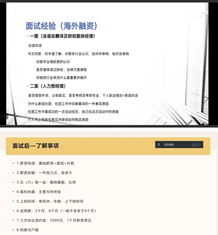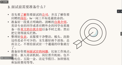 (2)对于最令人激动和紧张的面试环节,学长学姐们从面试前的准备工作,到面试时的高频问题和心态调整,再到面试后的注意事项和谈判技巧,都给同学们提出了最实用的建议。