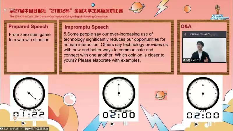 本次决赛分为以备演讲、即兴演讲和现场问答三个环节。经过激烈角逐,最终廖智捷同学夺得魁首并晋级国赛,王雪池同学荣获一等奖。