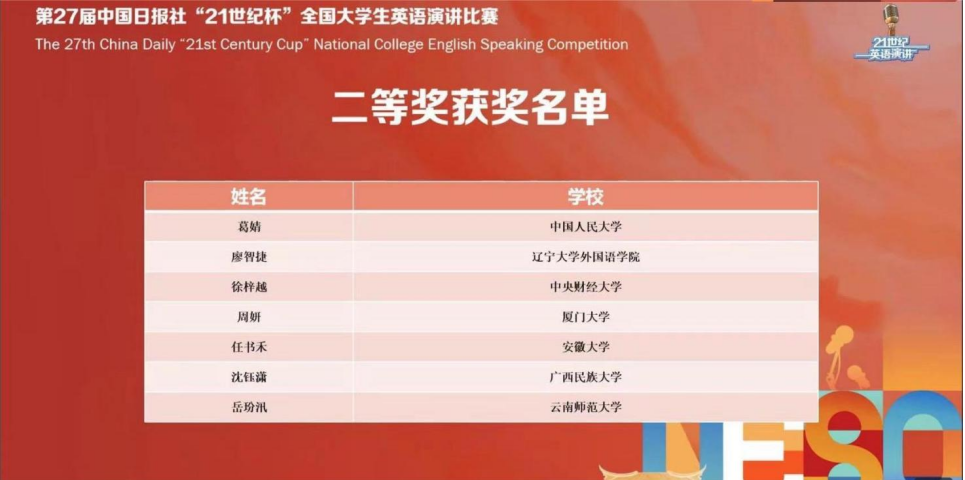 2022年10月3日,第27届中国日报社“21世纪杯”全国大学生英语演讲比赛全国总决赛在线上举行。来自全国30余个赛区的70余名选手在本次大赛中同台竞技,最终,我院2019级英语专业廖智捷同学荣获全国二等奖。